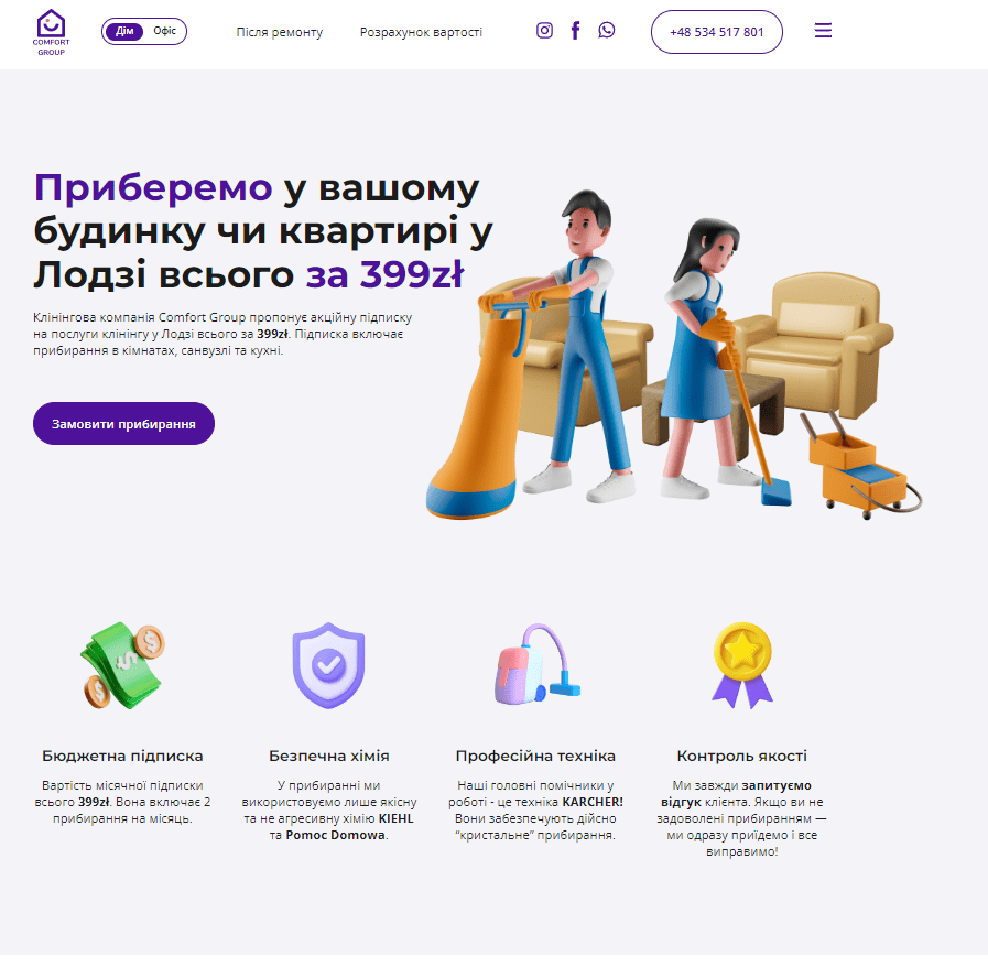 Website layout for a cleaning company using html, css, JavaScript, preprocessors and jQuery library. The site is made with adaptation for different screen sizes, the addition of a gallery with locations, the addition of titles (marks with explanations on locations), the addition of a burger menu with additional site navigation and a block of questions (accordion) with collapsed answers. Implementation of the functionality in pure JavaScript and jQuery.