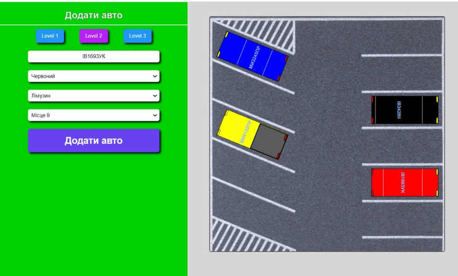 The application is implemented in JavaScript. Implemented the ability to use form input fields to set the parameters of the number, color, type of generation object, as well as select the generation coordinates. Implemented three parking maps with different positions for the location of objects. Work with forms, arrays, conditional operators, coordinates, creation of complex html objects is implemented.